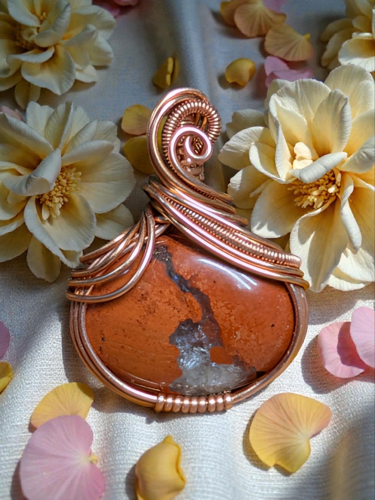 The red jasper came already written. I do not believe in perfect stones. Perfection is mute. What holds my attention are fractures that did not finish their work. This stone carries a line not division, but threshold. narrow passage where quartz gathers quietly, glistening like something overheard rather than announced. Copper does not sever it. It bends. It listens. It contains.